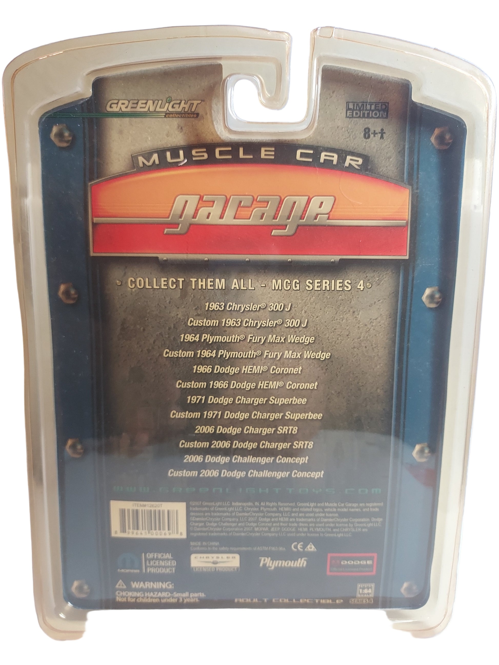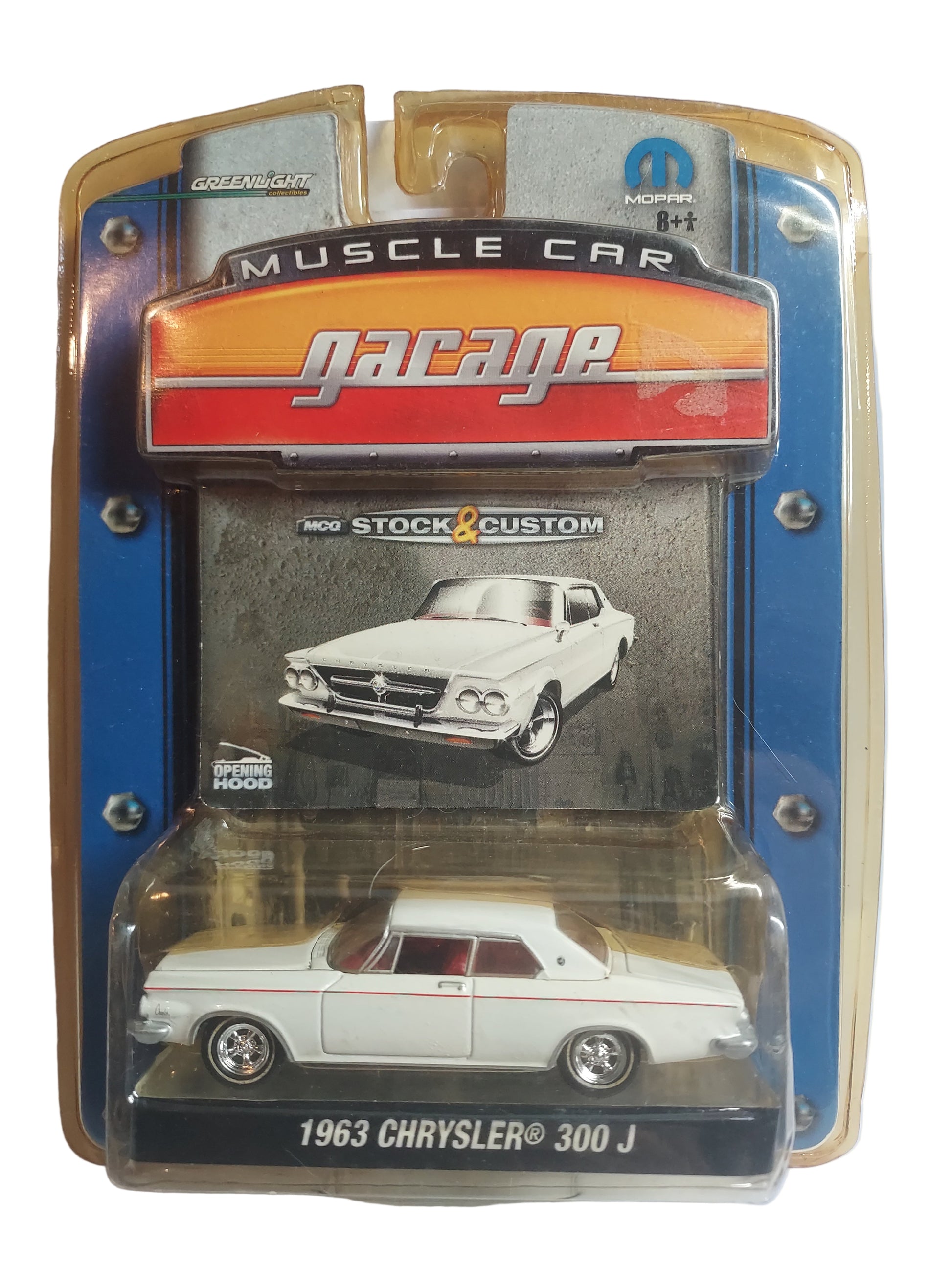 Es un coche a escala de la marca GreenLight, modelo 1963 Chrysler 300 J, que forma parte de la serie "Muscle Car Garage".