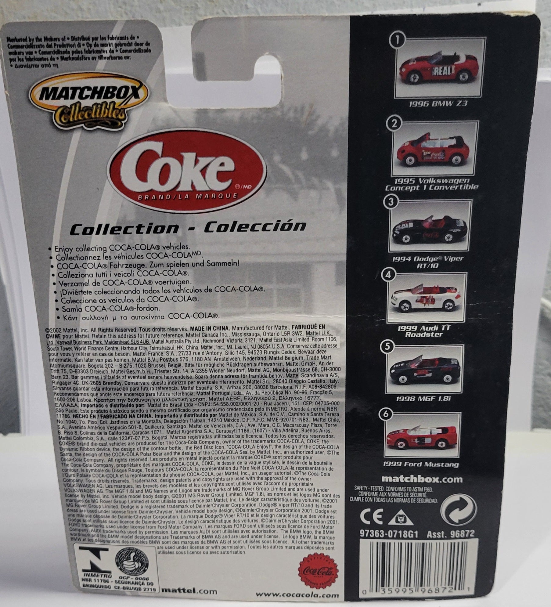 Es un coche de juguete Matchbox Collectibles de la colección de Coca-Cola, un BMW Z3 de 1996.