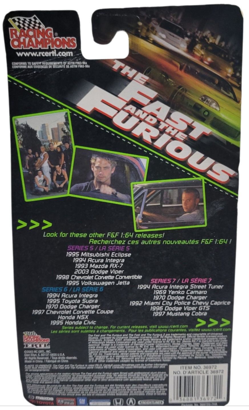 Este es un coche de juguete a escala 1:64 del 1970 Dodge Charger de la película Rápido y Furioso, fabricado por Racing Champions. El modelo es una réplica del coche de Dominic Toretto.