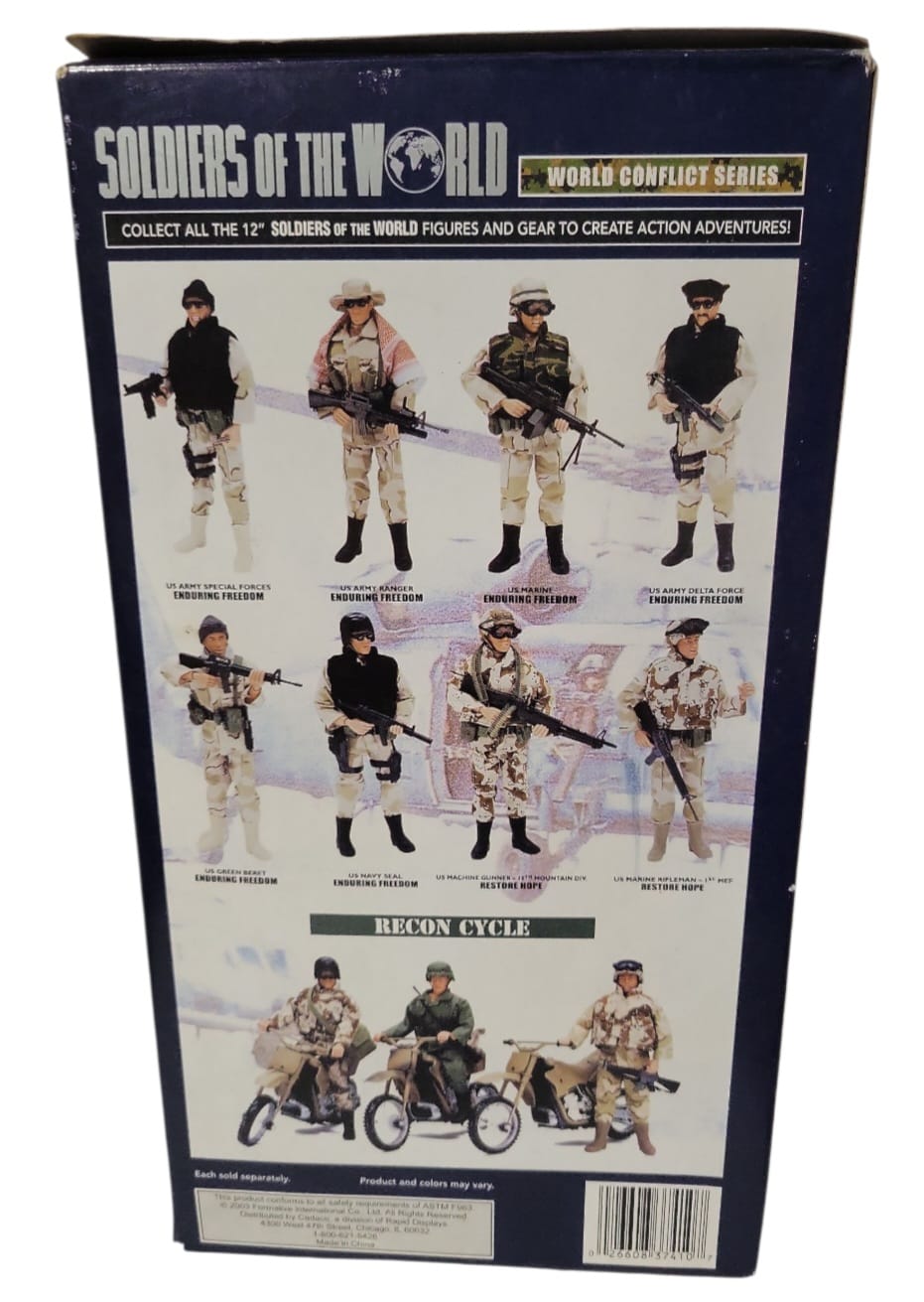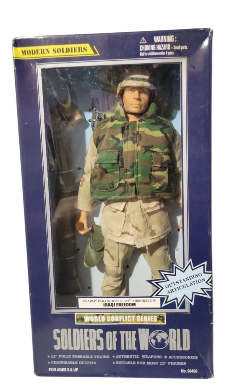 Paracaidista del ejército con uniforme camuflado y chaleco táctico. Figura de 12” con múltiples accesorios y detalles auténticos. Inspirada en los despliegues aéreos de la operación Iraqi Freedom.