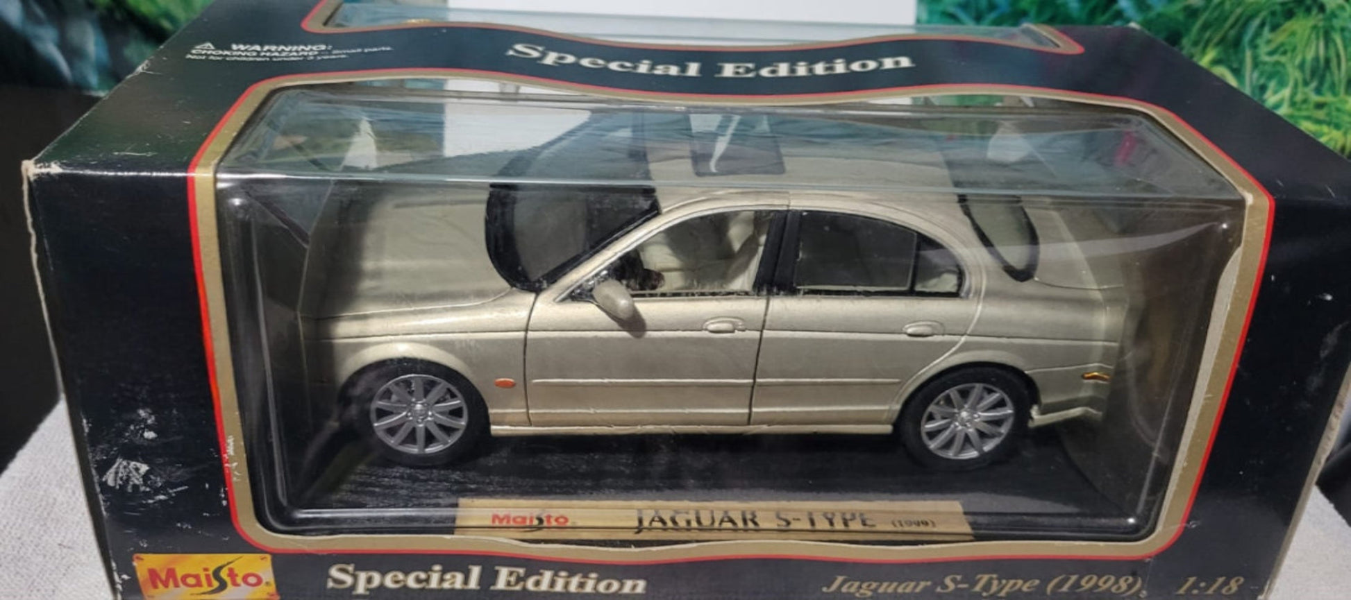 El objeto en la imagen es un coche de juguete a escala de un Jaguar S-Type de 1999, fabricado por Maisto como parte de su serie "Special Edition".