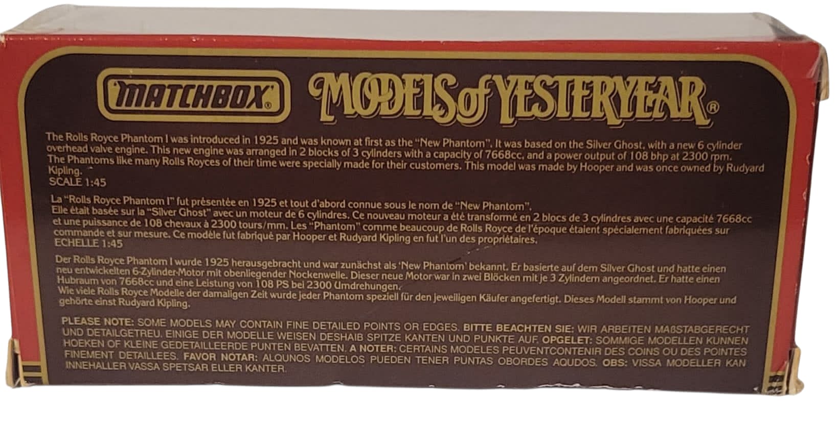 Se trata de un modelo a escala de un Rolls-Royce Phantom I rojo, parte de la colección "Models of Yesteryear" de Matchbox.