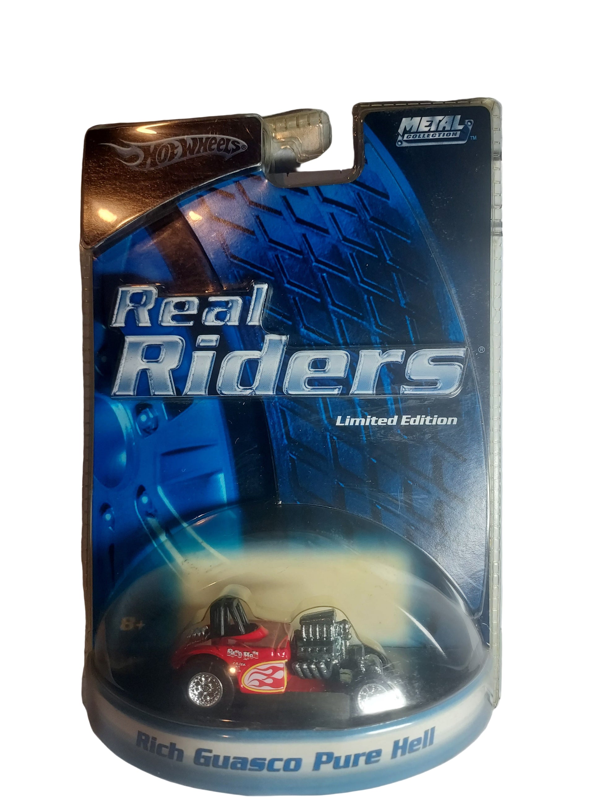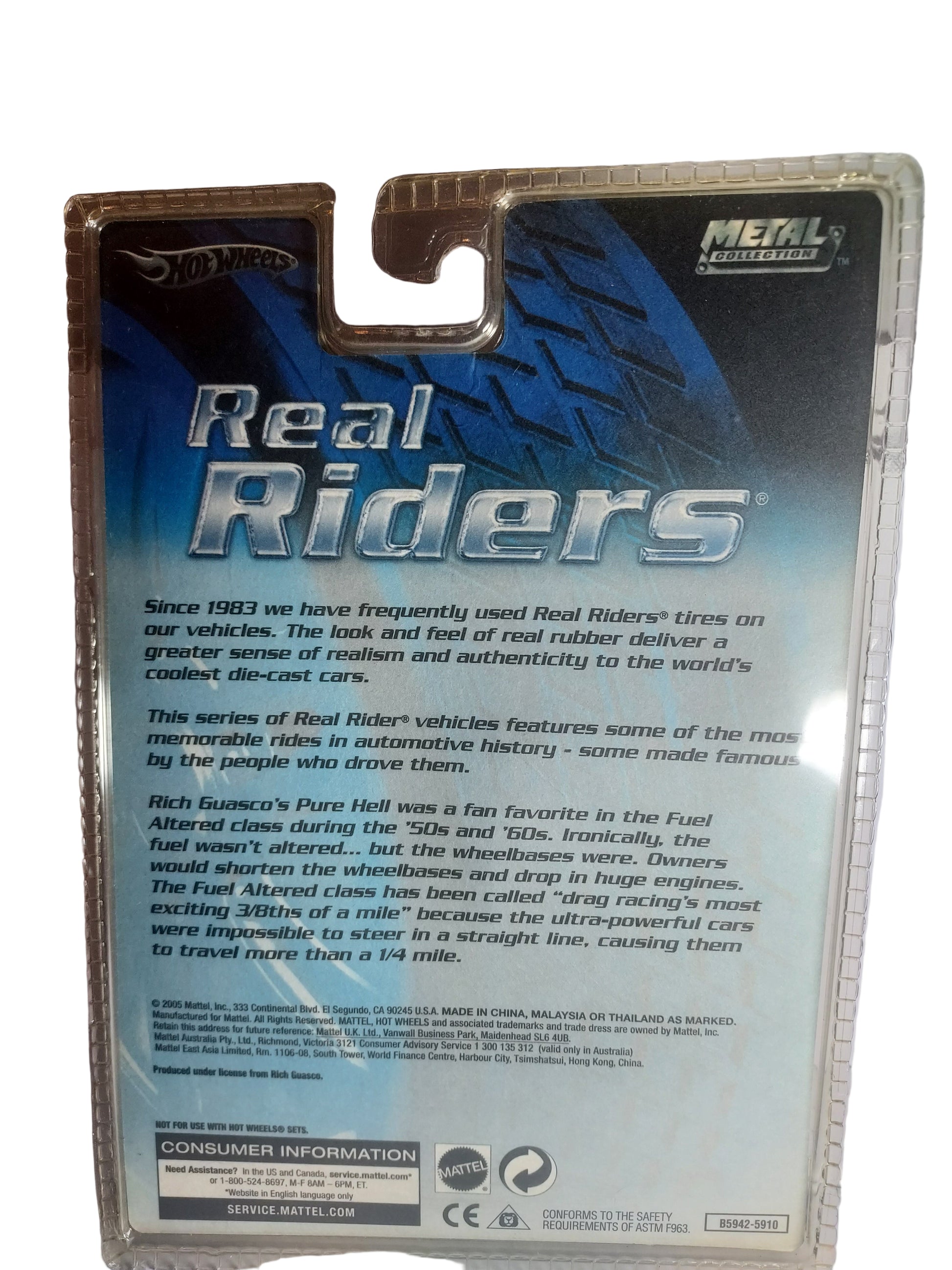 Es un coche de juguete Hot Wheels "Pure Hell" de la serie Real Riders. Los coches de la serie Real Riders se caracterizan por tener neumáticos de goma con banda de rodadura realista.