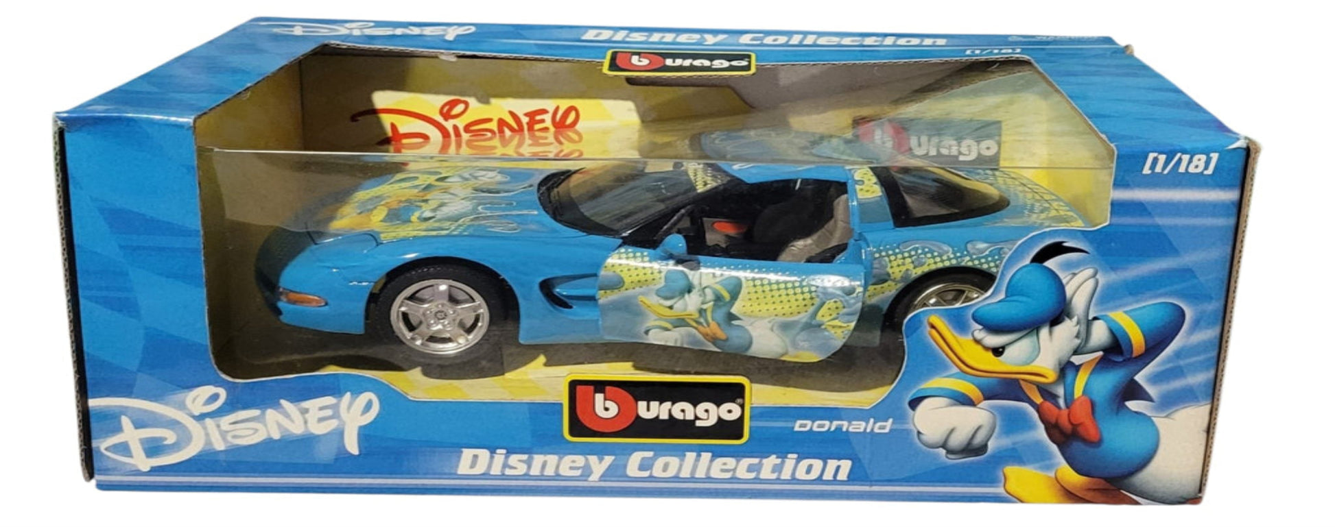 Coche de juguete a escala 1:18 de la marca Bburago, parte de la "Disney Collection", que representa un Chevrolet Corvette decorado con motivos del Pato Donald (Donald Duck) fabricado en Italia. En su empaque original. La caja puede tener desgaste menor por almacenamiento.