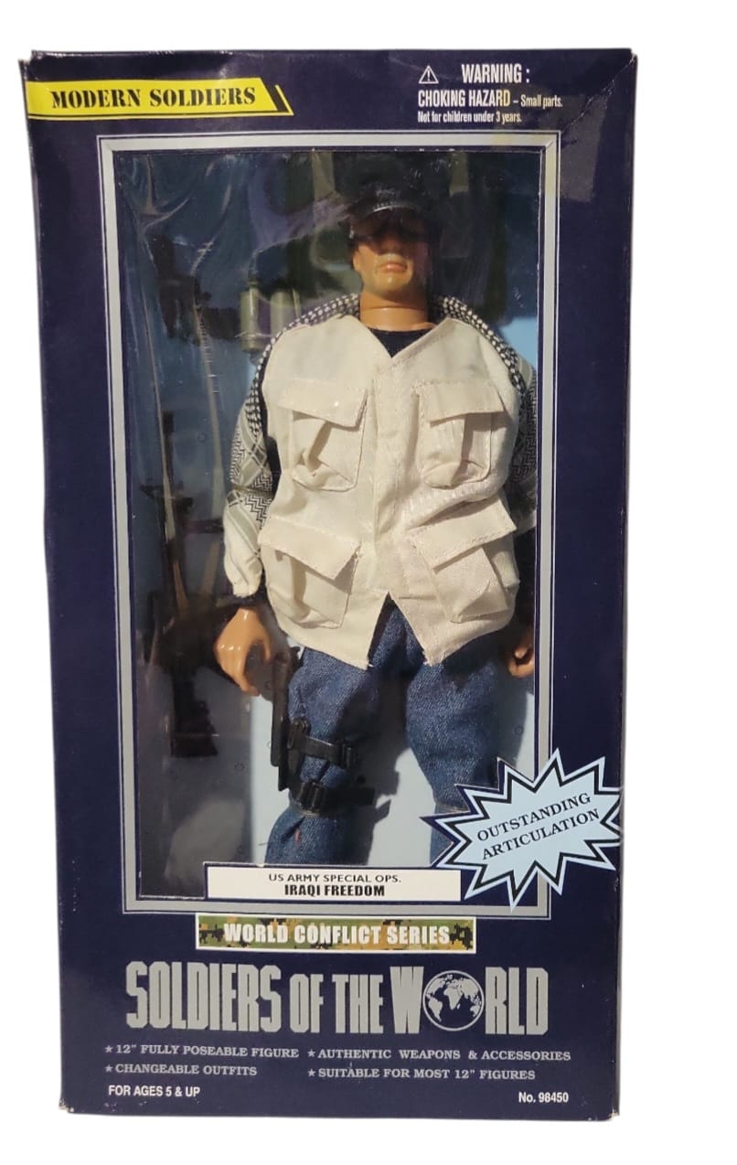 Figura de 12” totalmente articulada con uniforme moderno y accesorios intercambiables. Representa a un operador especial del ejército en la operación Iraqi Freedom. Incluye armas realistas y chaleco táctico.